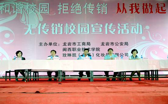 活动仪式上,吴开洪副局长、吴新业副院长和姜福建副局长先后发表讲话。琳玫凯福建分公司代表作“拒绝传销”的诚信宣誓;学生代表宣读“拒绝传销”倡议书,对全体师生发出了“和谐校园、拒绝传销、从我做起”的倡议;随后,与会来宾和师生在“拒绝传销、从我做起”的横幅上签名响应。