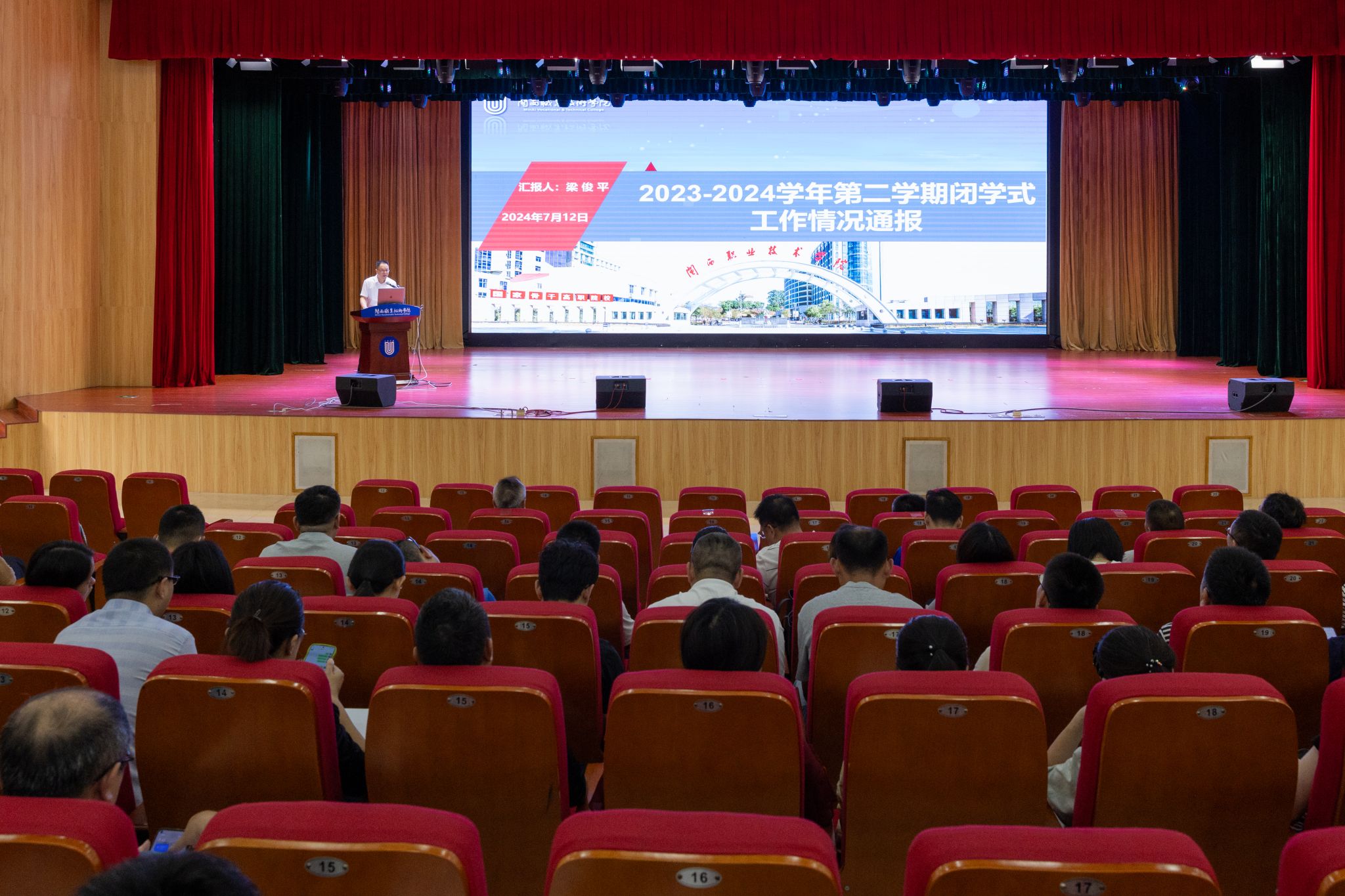 第二阶段,梁俊平校长通报了学期工作情况,回顾了本学期“予生最好学校”“双高”“科教融汇建设年”、就业等重点工作完成情况,并围绕党的建设、思政工作、教育教学改革、师资建设、对外交流合作和社会服务、治理体系和保障支撑等六个方面,既肯定了成绩,也提出了不足和要求。同时,部署了假期的重点工作任务。