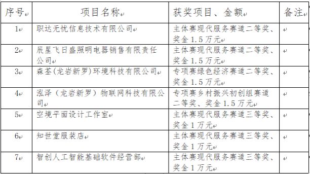此外,在第六届“中国创翼”创业创新大赛龙岩市级选拔赛中,我校共有7个项目获奖,该赛事奖金共计10余万元。优秀项目将代表龙岩市参加第六届“中国创翼”创业创新大赛省级比赛。详见下表: