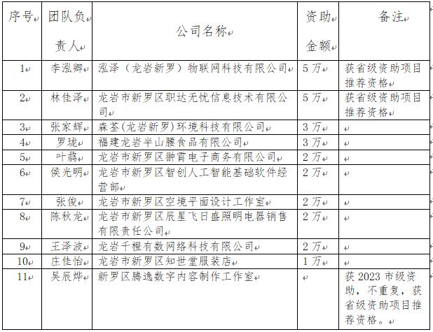 在第五届“创业龙岩”大中专毕业生创业市级资助项目申报评审中,截至目前,2024年我校共有11个大学生双创项目获得市级资助,资助金额达20万元。详见下表: