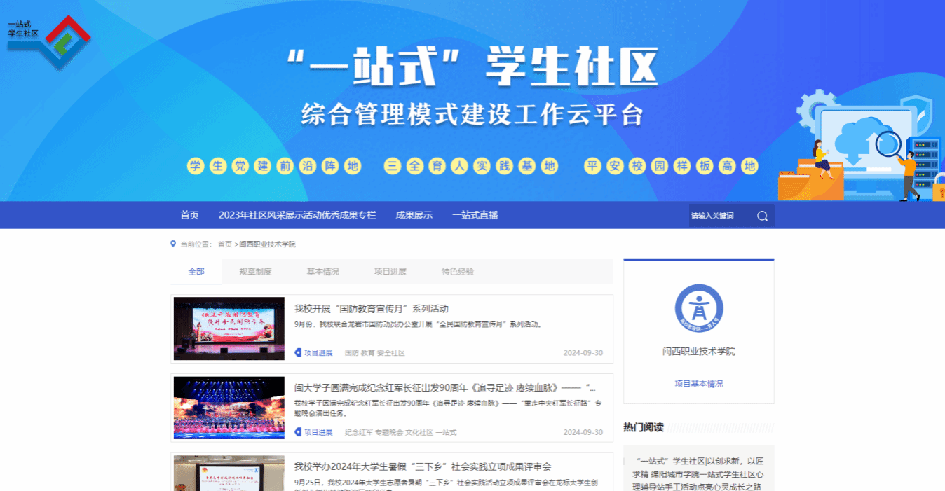 学校自2022年5月入选教育部“一站式”学生社区综合管理模式建设自主试点单位以来,围绕“双高”建设和“予生最好学校”建设,以“围绕学生、关照学生、服务学生”为工作理念,不断加大学生社区建立力度,强力推进“五进工程”,着力建设“五支队伍”,精心打造“五个平台”,持续推动领导力量、思政力量、专业力量、管理力量、服务力量在学生社区形成育人合力,构建富有红土特色、闽院特色的“一站式”学生社区育人实践新格局。