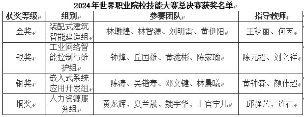 2024年10月31日,2024世界职业院校技能大赛总决赛争夺赛圆满落下帷幕,我校参赛团队在本届世界职业院校技能大赛总决赛争夺赛中荣获金奖1项、银奖1项、铜奖2项的好成绩。
