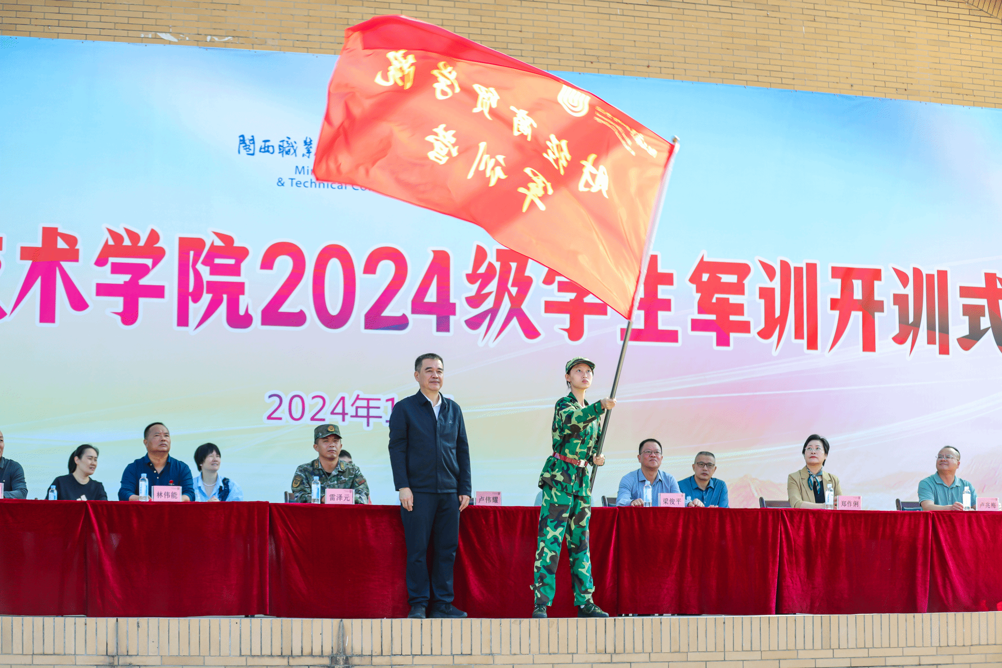 开训式上,举行了庄严的升国旗仪式。卢伟耀书记为七个军训营颁授营旗,鲜红的旗帜在空中挥展,如火焰般炽热;各学院接旗代表英姿飒爽,斗志昂扬。全体参训学生将以满腔的热血和坚定的信念,展现青春的活力与朝气,圆满完成军训各项任务。