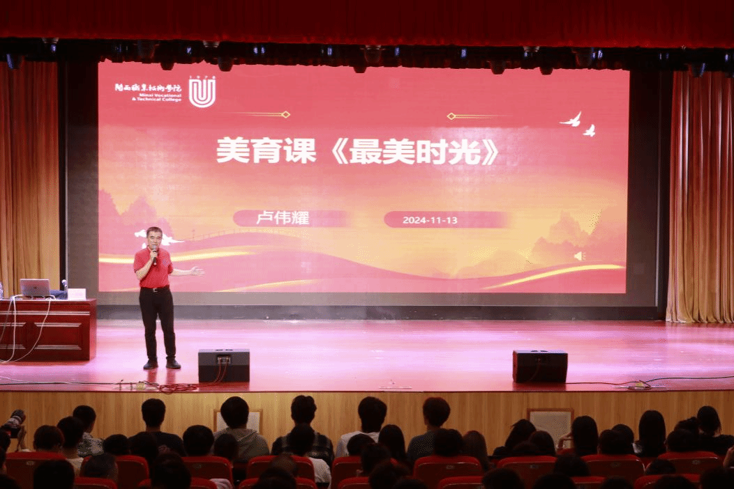 2024年11月13日,夜幕降临,华灯初上,我校首场美育特色课在大匠堂悄然而至。校党委书记卢伟耀以“最美时光”为主题,引领信息工程学院、软件工程学院800余名学生踏上了一场启迪心灵的美育之旅。