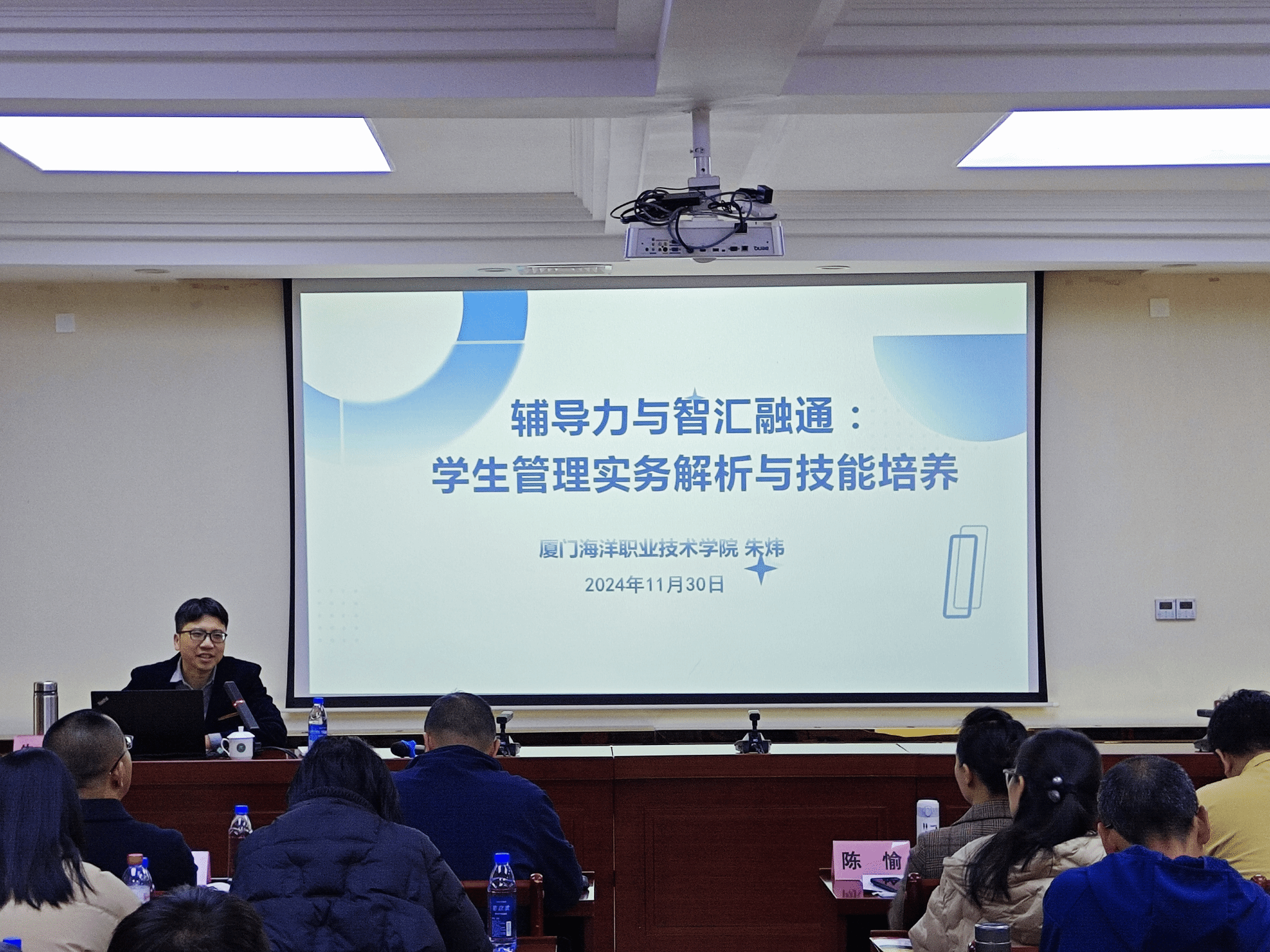 本次培训邀请到厦门海洋职业学院马克思主义学院思想政治理论课实践中心主任朱炜和龙岩学院党委宣传部副部长邱华锋分别围绕《辅导力与智汇融通:学生管理实务解析与技能培养》和《种好意识形态责任田,当好青年学生引路人》两个主题开展了理论教学。