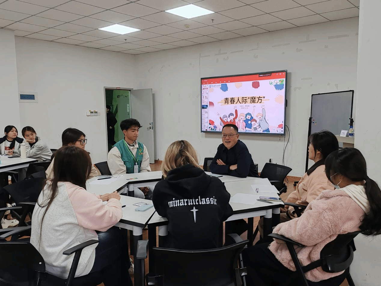 活动中柯铭海同学围绕“青春人际魔方”主题,生动剖析大学生人际交往特点,详细讲解积极倾听与表达技巧。在“五色拼盘”活动环节,同学们分组围坐,大家各抒己见,对自身情感需求与人际相处之道有了深刻洞察。