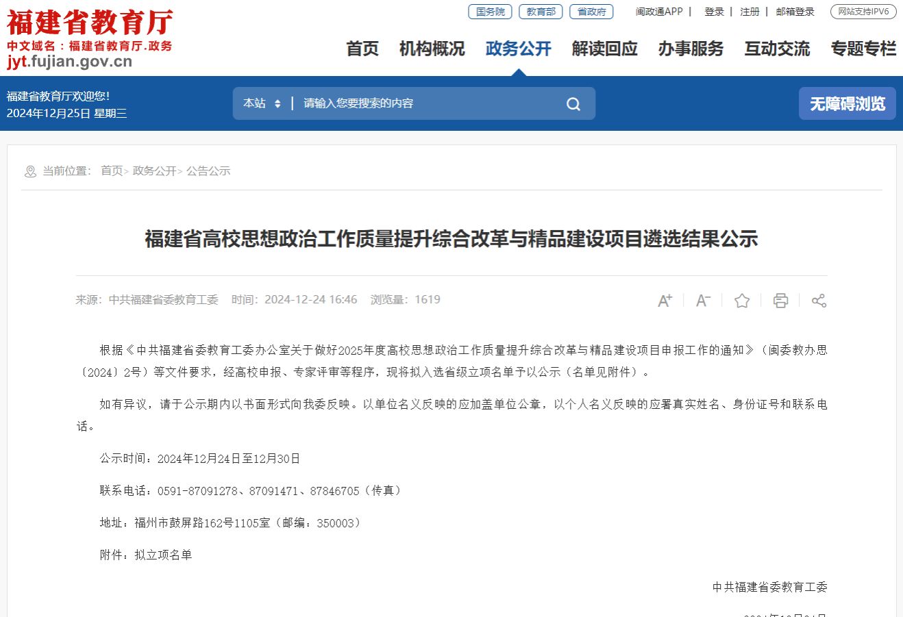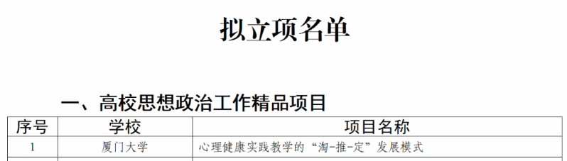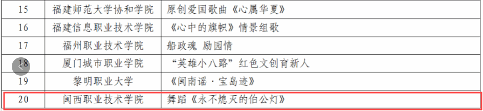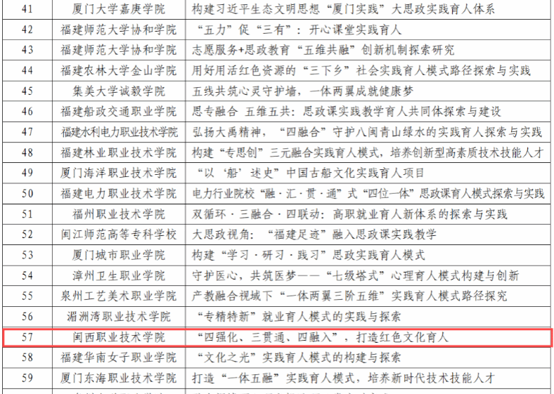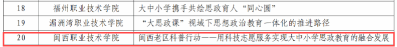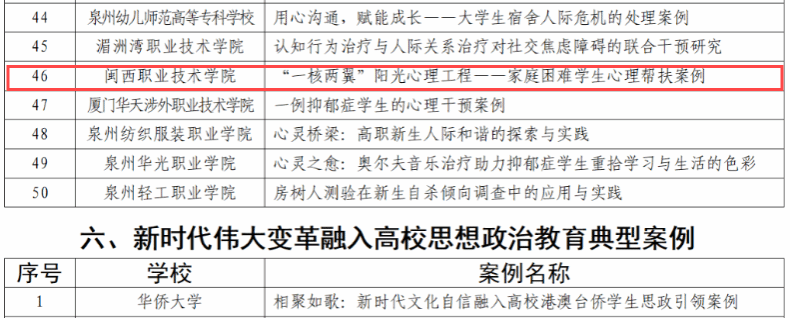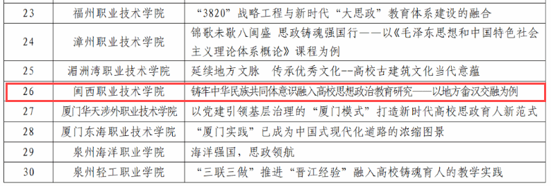 12月24日,教育厅发布了《福建省高校思想政治工作质量提升综合改革与精品建设项目遴选结果公示》,我校申报的项目《“四强化、三贯通、四融入”,打造红色文化育人模式》(负责人:涂海英)入选高校思想政治工作精品项目、舞蹈《永不熄灭的伯公灯》(负责人:谢凯露)入选高校原创文化精品、案例《“一核两翼”阳光心理工程——家庭困难学生心理帮扶案例》(负责人:葛宾)入选高校学生心理健康教育指导典型案例、案例《铸牢中华民族共同体意识融入高校思想政治教育研究——以地方畲汉交融为例》(负责人:杜谷文)入选新时代伟大变革融入高校思想政治教育典型案例、案例《闽西老区科普行动——用科技志愿服务实现大中小学思政教育的融合发展》(负责人:刘剑友)入选大中小学思想政治教育一体化建设工作典型案例。五个项目入选标志着我校思想政治教育工作取得新突破。