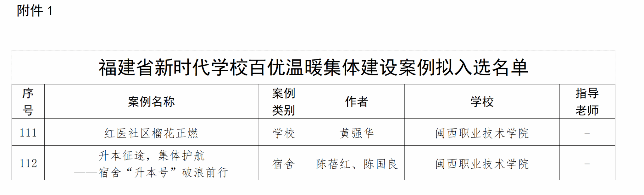 近日,福建省教育厅发布了《关于福建省新时代学校百优温暖集体建设案例拟入选名单的公示》。我校选送的《红医社区榴花正燃》(作者:黄强华)和《升本征途,集体护航——宿舍“升本号”破浪前行》(作者:陈蓓红、陈国良)两篇案例成功入选,充分展示了我校在班集体建设工作中的突出成果和有效实践。