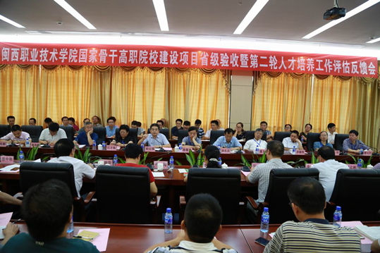 9月23日至25日,福建省教育厅委托省教育评估研究中心组织由上海理工大学博士生导师、上海传媒研究院执行院长、上海出版专科学校原校长、上海教育评估院特聘首席专家陈敬良教授任验收、评估组组长的16人专家组对我院国家骨干高职院校建设项目进行省级验收和第二轮人才培养工作评估。专家组通过实地考察、观看建设成果视频、听取项目建设情况和重点专业建设情况汇报、访谈相关人员、审阅资料等形式,对我院国家骨干高职院校建设项目和第二轮人才培养工作进行了全面检查验收和评估。龙岩市人大常委会杨闽副主任,市人民政府郭丽珍副市长,市政协姚植华副主席,市委邹方清副秘书长,市政府罗初辉副秘书长,市教育局朱瑞虹局长及学院全体领导班子成员等参加汇报会和反馈会。