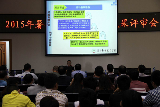 9月15日下午,我院2015年暑期社会实践立项成果评审会在办公楼二楼会议室举行。副院长吴新业、院长助理李伟闽,党委工作部、纪检监察室、办公室、学生工作处、学报编辑部、校企合作处、保卫处、团委等相关部门负责人,部分系(部)党总支书记,各系(部)团委书记、辅导员、实践团队学生代表等近百人参加评审会。