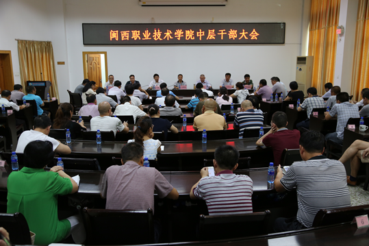 7月13日下午,我院中层干部大会在办公楼二楼会议室召开,院党委书记马春延、院长来永宝,院领导吴新业、刘路永、卢兆梅、李贞鑫、院长助理李伟闽和全体中层干部参加会议。院长来永宝总结了2014-2015学年第二学期的工作,对骨干校建设“两部”验收和第二轮高等职业院校人才培养工作评估迎评工作进行再动员、再部署,对暑期工作进行了具体安排,提出了具体要求。