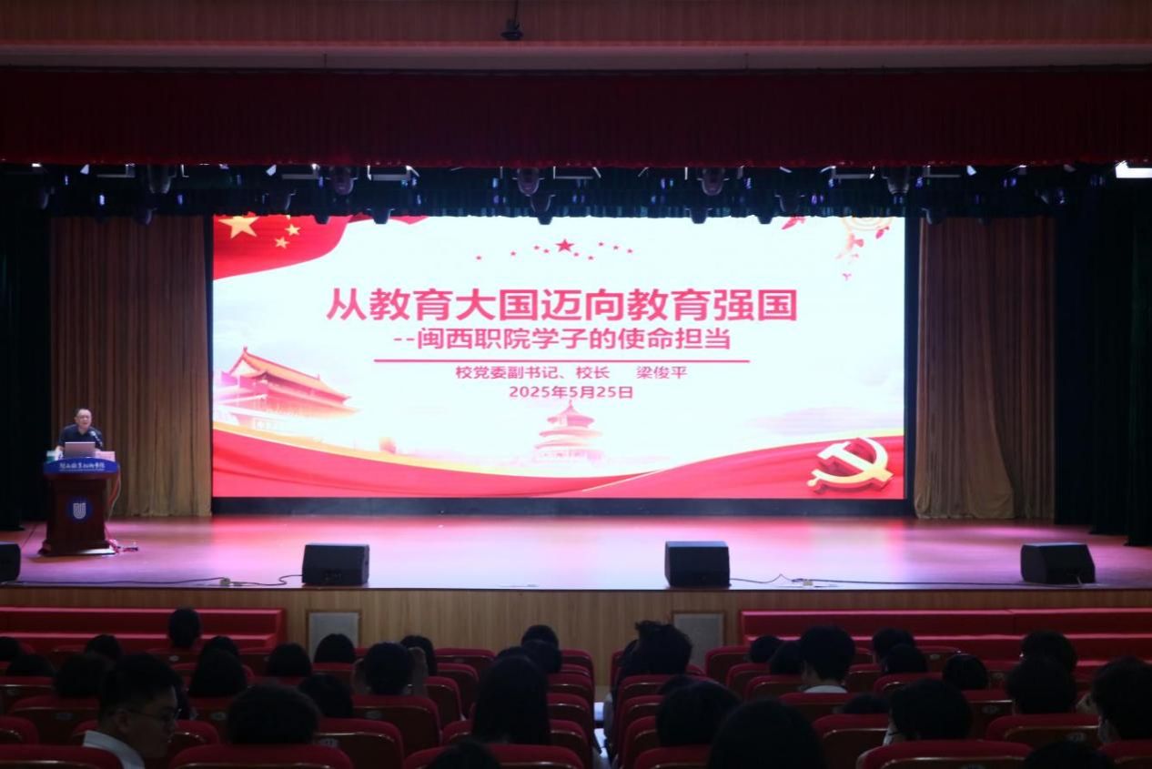 2025年5月25日,梁俊平校长、连玲娜副校长分别在大匠堂、万源楼三楼路演厅为我校学生上思政课。梁俊平校长以“从教育大国迈向教育强国——闽西职院学子的使命担当”为主题为青马学员、团属学生干部、入团积极分子、信息工程学院学生等600余名学生授课;连玲娜副校长以“青春由磨砺而出彩 人生因奋斗而升华”为主题与100余名青马学员深入交流。
