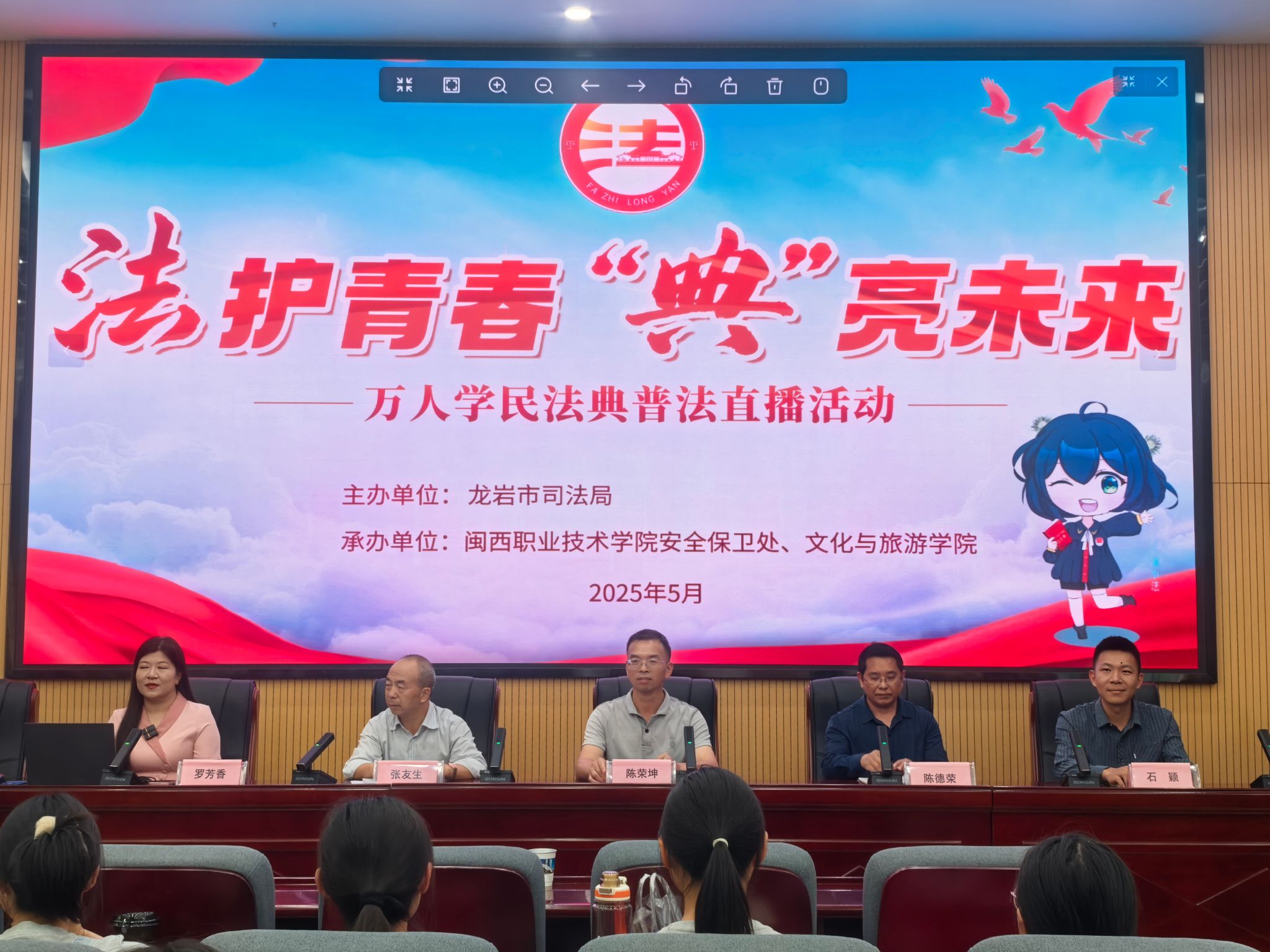 文化与旅游学院党委负责人对龙岩市司法局的到来表示热烈欢迎,并强调了民法典学习的重要性。龙岩市司法局张友生副局长表示2025年5月是第五个“民法典宣传月”,其主题为“美好生活 民法典相伴”,并介绍民法典的颁布背景和主要内容,鼓励师生积极参与,共同提升法治素养。