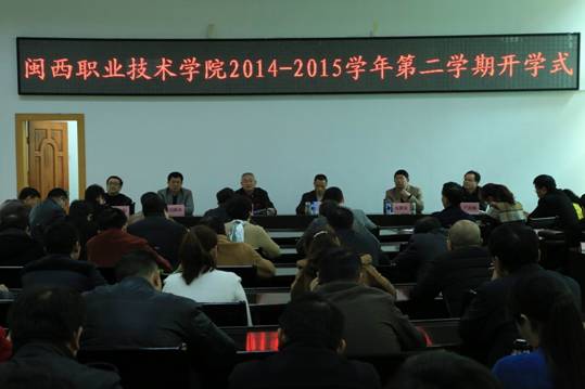 3月7日下午,无码人妻AV一二区二区三区2014-2015学年第二学期开学式在办公楼二楼会议室举行。党委书记马春延,院长来永宝,副院长吴新业、刘路永、卢兆梅,院长助理李伟闽,全体中层干部,骨干校重点建设专业主任等近90人参加。