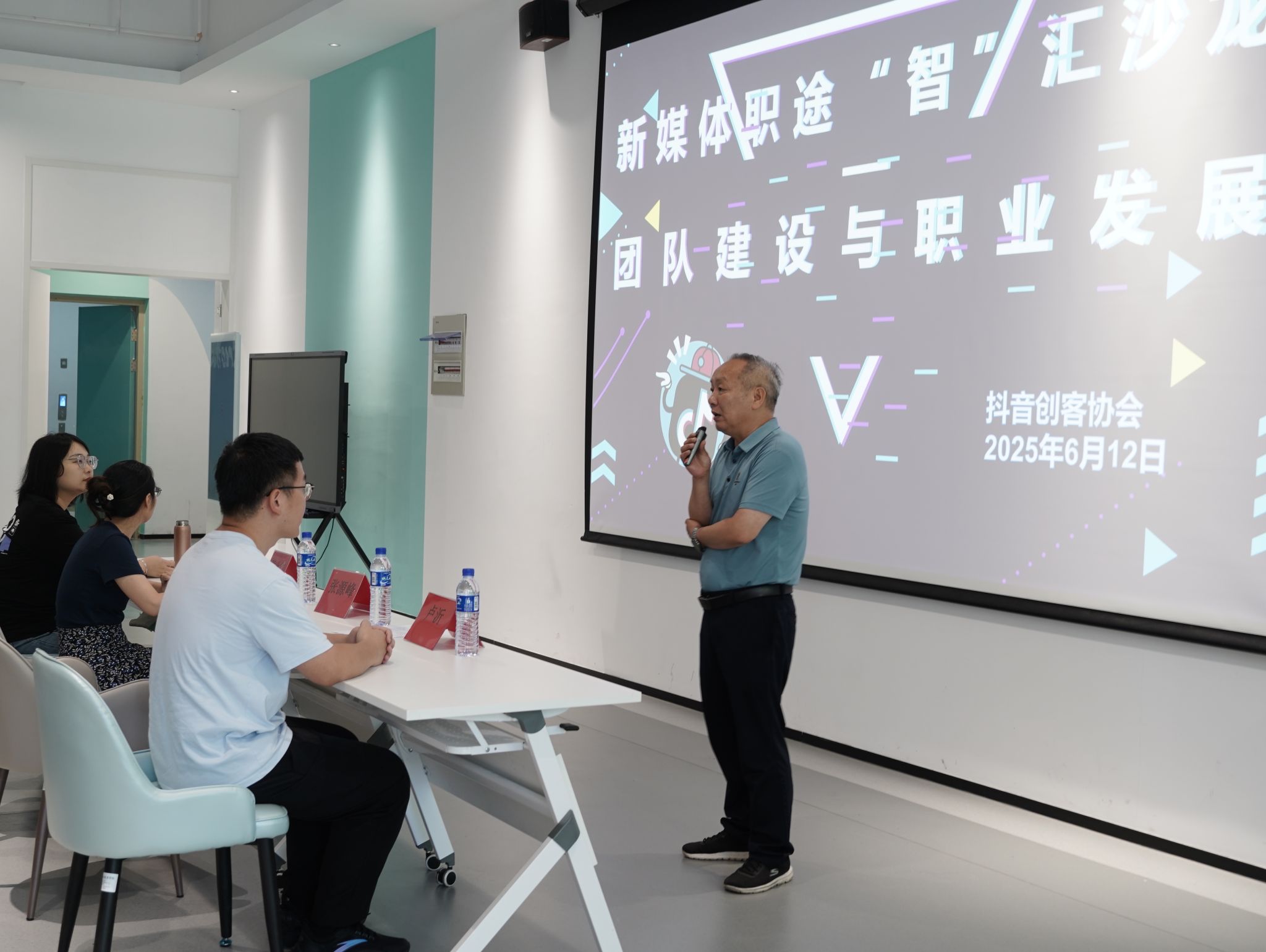 2025年6月12日,我校抖音创客协会在万源楼众创空间举办“新媒体职途‘智’汇沙龙 团队建设与职业发展”活动。张源峰副校长、财经商贸学院领导、老师及协会30余名同学参加本次沙龙活动。