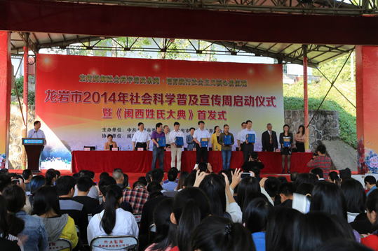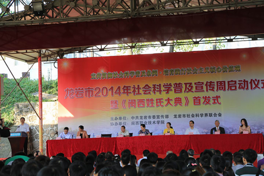 10月18日上午,龙岩市2014年社会科学普及宣传周启动仪式暨《闽西姓氏大典》首发式在我院槟龙球场隆重举行。市人大常委会副主任杨闽,市政府副市长郭丽珍,市政协副主席李新春,市委宣传部副部长傅柒生,我院副院长吴新业等领导出席开幕式。市台办、市外事侨务办、市总工会、团市委、市妇联等部门负责同志,市社科联所属学会(研究会、协会)有关人员和我院师生共500多人参加了开幕式。开幕式由市委宣传部部务会成员、市社科联主席兰尚进主持。