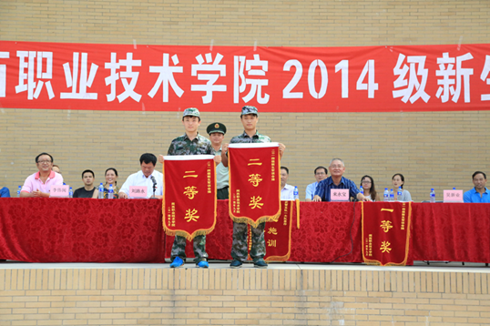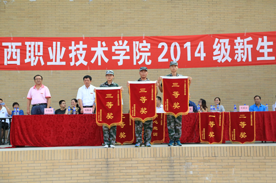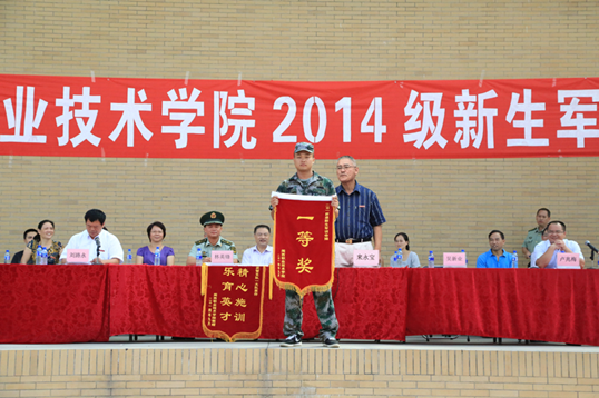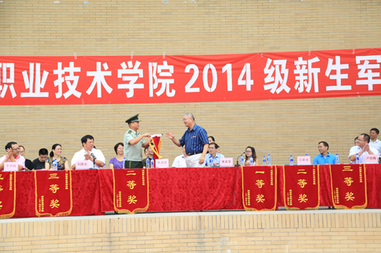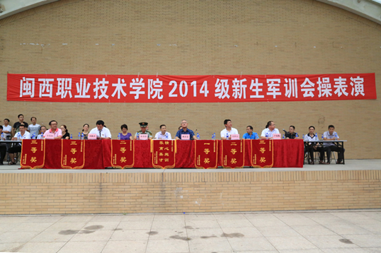 院长来永宝教授向武警龙岩支队一大队赠送锦旗。主席台前排就坐的领导为军训会操表演一、二、三等奖的集体颁奖。学院武装部部长陈文东宣读了《关于表彰2014级军训工作先进个人的决定》和“2014级新生军训会操表演评比结果”。土木建筑工程系荣获军训会操表演一等奖,管理系和机械工程系荣获军训会操表演二等奖,经济系、旅游系、电气工程系荣获军训会操表演三等奖。
