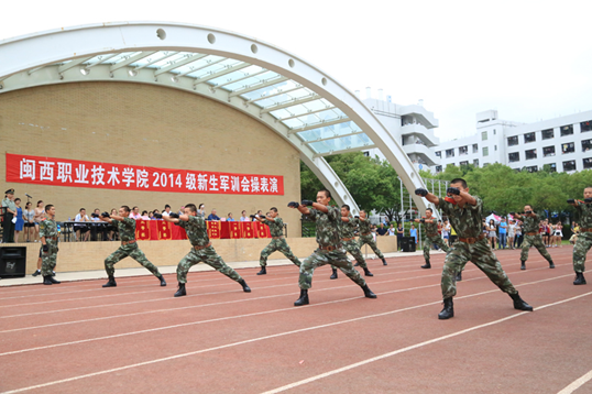 9月20日上午,2014级新生军训会操表演在学院标准田径场隆重举行。在家院领导来永宝、吴新业、刘路永、卢兆梅、院长助理李伟闽,武警龙岩支队一大队副大队长林英锋,各党总支、部门、单位负责人出席。2000多名新生观看了会操表演。军训会操表演由副院长刘路永主持。