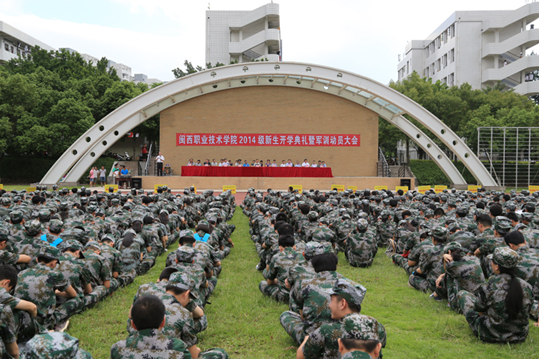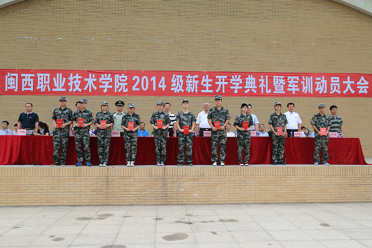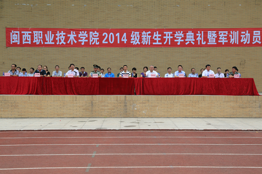 9月15日上午, 2014级新生开学典礼暨军训动员大会在学院田径场隆重举行。院领导马春延、来永宝、吴新业、刘路永、卢兆梅、李贞鑫,院长助理李伟闽,武警龙岩一大队副大队长林英锋,优秀校友、厦门金天高传媒有限公司董事长俞华明,各党总支、部门、单位负责人出席动员大会。近2000名2014级新生参加大会。大会由副院长吴新业主持。