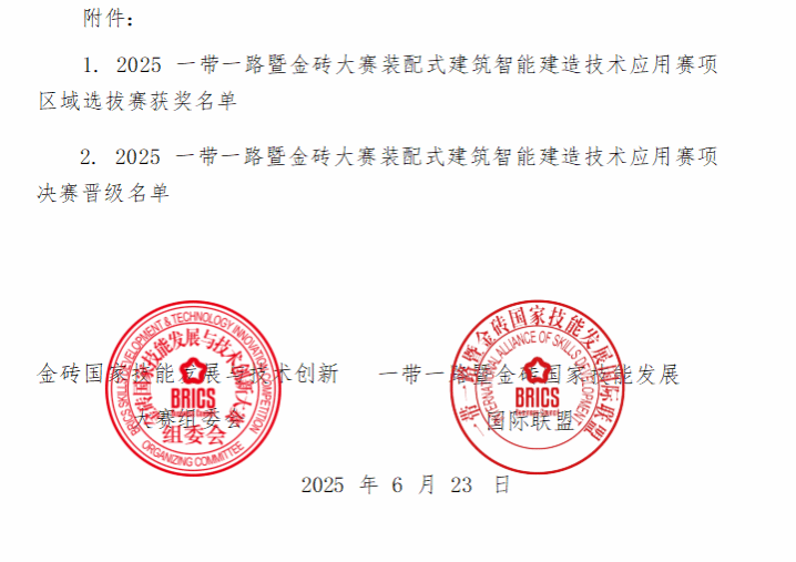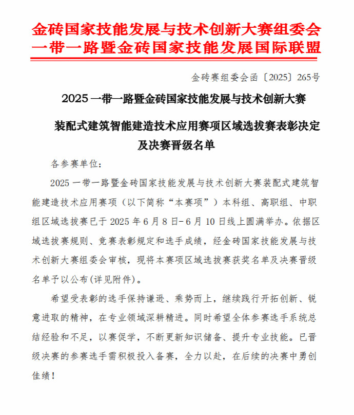 据金砖国家技能发展与技术创新大赛组委会、一带一路暨金砖国家技能发展国际联盟公布的区域选拔赛表彰决定及决赛晋级名单,我校选派的装配式建筑智能建造技术应用赛项两支代表队,在高职组321支参赛队伍的激烈竞争中,分别以第一、第二名的成绩双获一等奖,成功晋级国赛。
