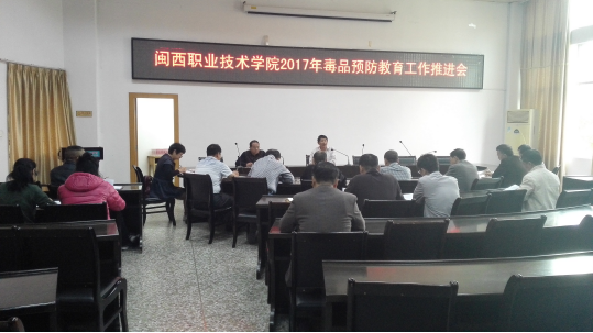 为进一步推动我校大学生毒品预防教育工作规范化、制度化,创建“龙岩市2017年毒品预防教育活动示范学校”,11月6日上午,我校2017年毒品预防教育工作推进会在办公楼二楼召开。会议由副校长吴新业主持,校长助理李伟闽,组织人事处、宣传统战部、教务处、学工处、团委、安全保卫处、信息网络中心负责人及各二级学院党委、系党总支负责人参加。