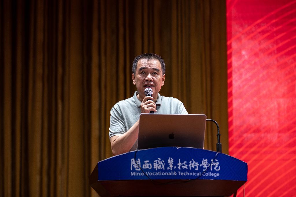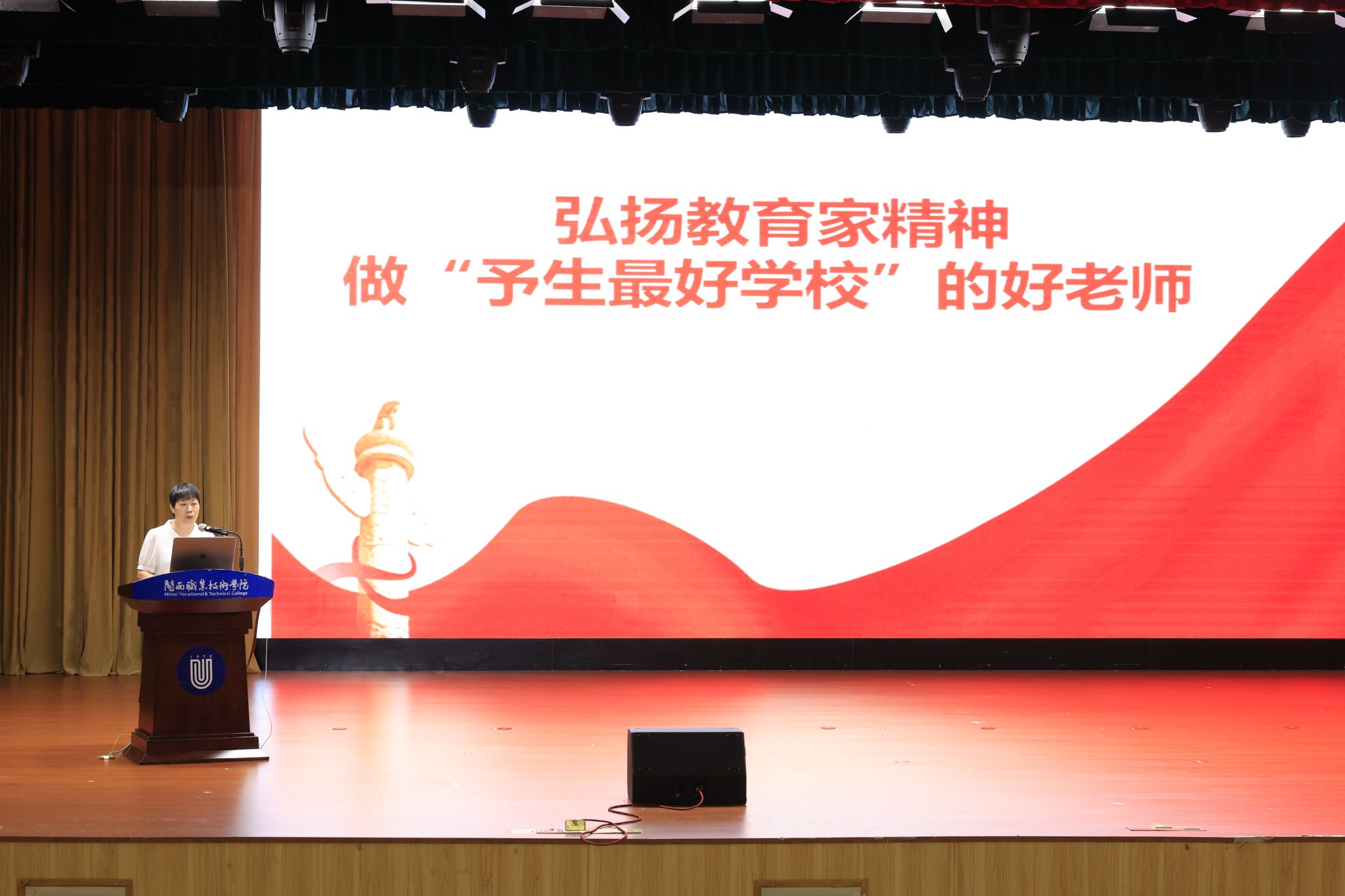大会首先开展师德大讲堂活动,全国优秀教师吴淑娟教授以《弘扬教育家精神,做“予生最好学校”的好老师》为题,结合自身多年教育实践经验,深入解读教育家精神“心有大我、启智润心”的核心内涵,结合职业教育“技能育工匠”的属性和我校“红旗永不倒”的苏区红色基因,倡议全校老师们当好“双师赋能”践行者、“因材施教”的引导者、“德技并修”的示范者、“生有所依”的守护者,坚持“予生最好”办学理念,潜心培育新时代红色工匠。