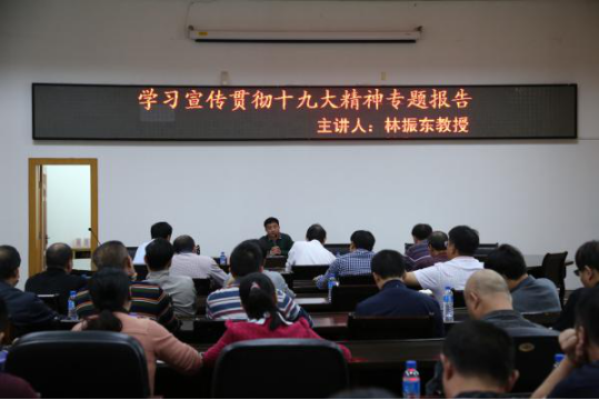 11月7日下午,我校在办公楼二楼会议室召开学习宣传贯彻十九大精神专题报告会,思想政治理论课教研部主任林振东教授作《迈进新时代 开启新征程 谱写新篇章---学习领会党的十九大报告精神》专题报告。学校纪委书记李贞鑫主持报告会,在家副校长吴新业、刘路永,校长助理李伟闽及全体中层干部听取专题报告。