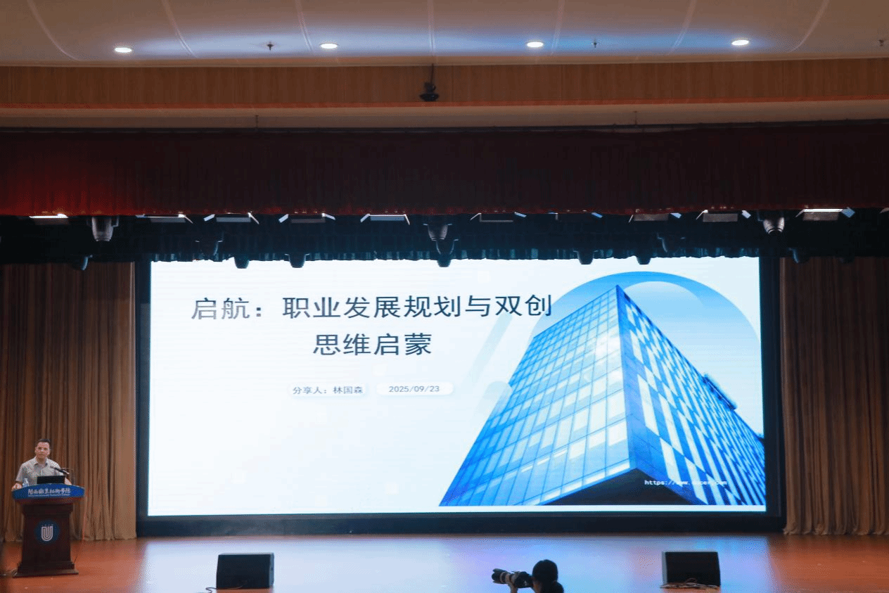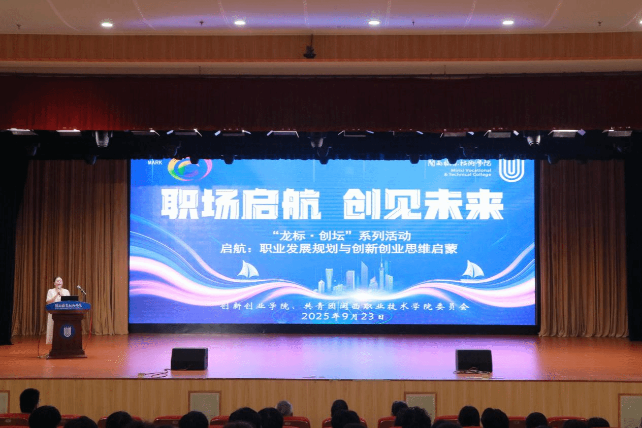 9月23日下午,我校在大匠堂举办2025-2026学年第一学期“职场启航,创见未来——龙标·创坛”首场活动暨职业发展规划与双创思维启蒙讲座,活动由创新创业学院与校团委联合举办,副校长张源峰,创新创业学院、职业规划教研室老师、校青创服务站干部、二级学院2025级新同学等共计700余人参加,同时通过直播覆盖全校(含天马校区、汀州校区)新同学。