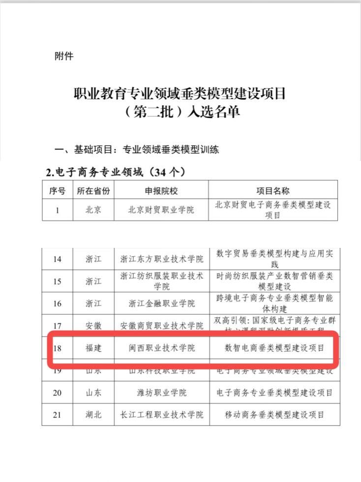 2025年9月24日,财经商贸学院《数智电商垂类模型建设项目》成功入选由教育部职业教育中心审批通过的《教育部职业教育中心职业教育专业领域垂类模型建设项目(第二批)入选名单》,这是学院电子商务专业群在省“双高”建设进程中的又一重大成果。