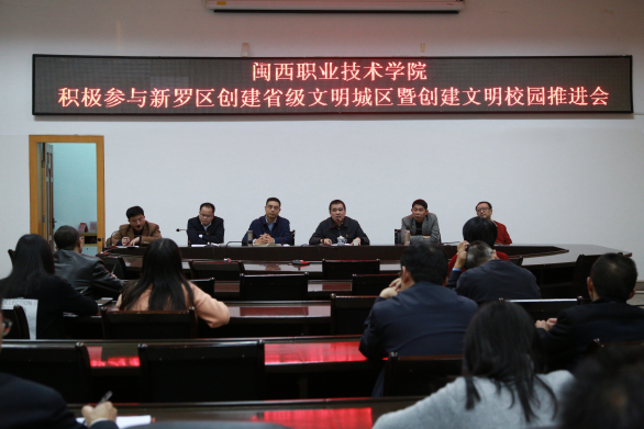 12月5日下午,我校在办公楼二楼会议室召开积极参与新罗区创建省级文明城区暨创建文明校园推进会。党委书记卢伟耀,校长郑志强,校领导吴新业、卢兆梅、李贞鑫,校长助理李伟闽,各学院党委、系党总支负责人及部门、单位负责人参加会议。副校长卢兆梅主持会议。