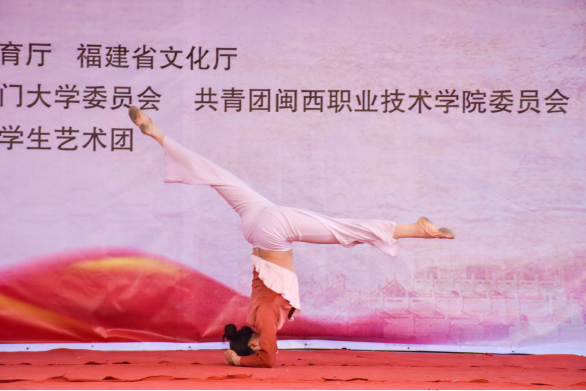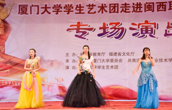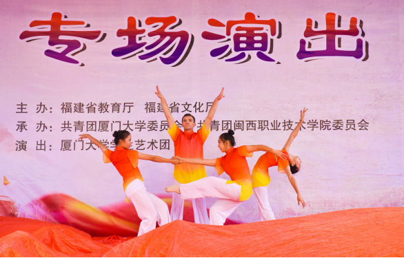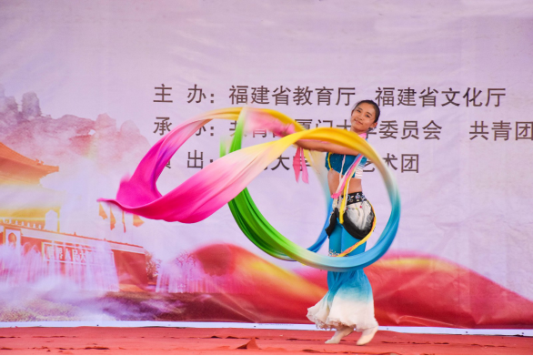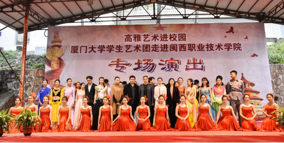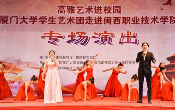此次高雅艺术进校园活动由《没有共产党就没有新中国》和《最美中国梦》两个篇章组成。在全场观众热烈的掌声中,厦门大学学生艺术团向现场师生表演了歌舞《不忘初心》,歌曲《南湖的船》《美丽祖国》,陶笛独奏《千年风雅》,琵琶齐奏《送我一支玫瑰花》等15个优秀作品。悠扬高亢的歌声、精彩绝伦的舞蹈带全体观众重温了那段红色革命岁月,再现了一个个英烈事迹,带领全体观众畅想美丽中国,同心共筑中国梦。演出最后在全体演员合唱《歌唱祖国》和观众们热烈掌声中圆满落下帷幕。