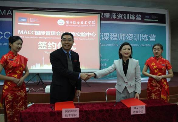 3月17日-18日,我校与IMA(美国管理会计师协会)中国教育分会建立合作关系,双方合作共建“MACC国际管理会计教育实验中心”签约、揭牌仪式暨MACC管理会计能力素质认证课程师资训练开营在我校举行。IMA董事会国际董事浦军,IMA中国教育分会执行会长马瑞阳,我校校长郑志强、副校长吴新业,浪潮铸远公司总经理马建军、市场总监陈玲,会计乐CEO蔡丽煌,财经商贸学院党政班子成员,国内各大高校、培训机构近百名教师等参加此次师资训练营。训练营由IMA中国教育分会、厦门会计乐公司联合主办,我校和惠生会计联合承办。