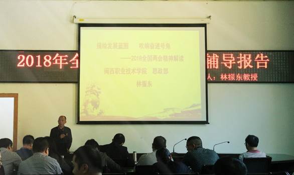 4月17日下午,我校在办公楼二楼会议室举行学习2018全国两会精神专题报告会,思想政治理论课教研部主任林振东教授作《描绘发展蓝图 吹响奋进号角--2018全国两会精神解读》专题报告。在家校领导吴新业、卢兆梅,校长助理李伟闽及全体中层干部听取专题报告。