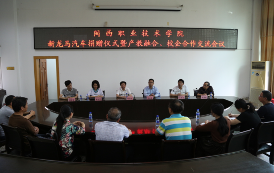 捐赠仪式举行完后,校企双方人员就产教融合、校企合作等内容进行交流,就继续共建“新龙马汽车学院”,校企协同育人,共同申报国家级“现代学徒制”试点专业、共同进行“二元制”汽车检测与维修技术专业招生、共建“汽车研发技术中心”等事宜开展了深入探讨。
