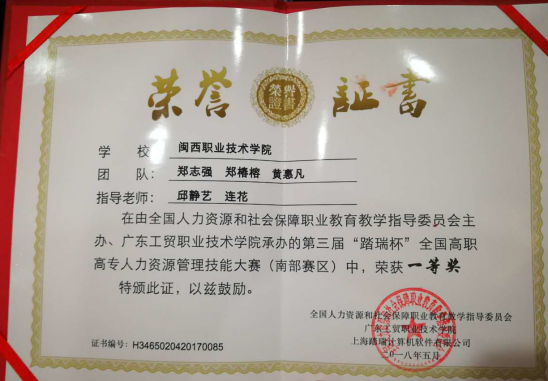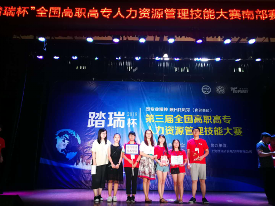 5月26日,由全国人力资源和社会保障职业教育教指委主办的第三届全国高职院校人力资源管理技能大赛(南部赛区)在广州举行,我校财经商贸学院人力资源管理专业代表队(指导老师:邱静艺、连花,选手:郑志强、郑椿榕、黄惠凡)在南部赛区34支参赛队伍的激烈角逐中脱颖而出,荣获一等奖。下一步,将代表学校参加该项目全国总决赛。