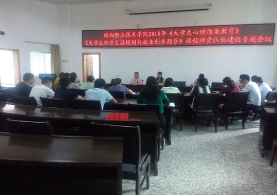 6月25日上午,我校在办公楼二楼会议室召开了《大学生心理健康教育》《大学生职业生涯规划与就业指导》两门课程师资建设专题会议,启动了两门课程新一轮规范化建设工作。
