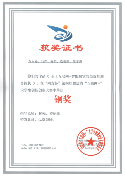 8 月 28日,第四届“互联网+”大学生创新创业大赛决赛在厦门大学落下帷幕,由我校选送的青年创业项目《基于互联网+智能视觉的高效检测分拣机》获得铜奖。该项目由信息与制造学院黄永春同学负责,林福和罗炳莲担任指导老师。