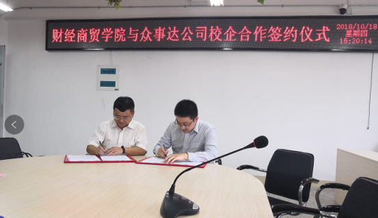 10月18日下午,财经商贸学院与众事达(福建)信息技术股份有限公司举行校企合作签约仪式。仪式由财经商贸学院党委书记主持,众事达厦漳大区总监方汉宝、人力资源经理朱春芳、厦门分公司经理卢凤珍、厦门分公司校企合作订单班班主任程晓娟和财经商贸学院班子成员、电子商务专业教师、2018级电子商务1班学生参加了仪式。