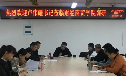 3月6日,校党委书记卢伟耀赴挂钩院系——财经商贸学院开展调研活动,财经商贸学院班子成员和专业主任、秘书参加调研。
