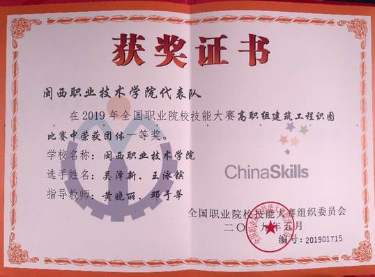 5月11日,2019年全国职业院校技能大赛高职组“建筑工程识图”赛项在天津举行。我校该项目代表队荣获团体一等奖(全国第2名)。
