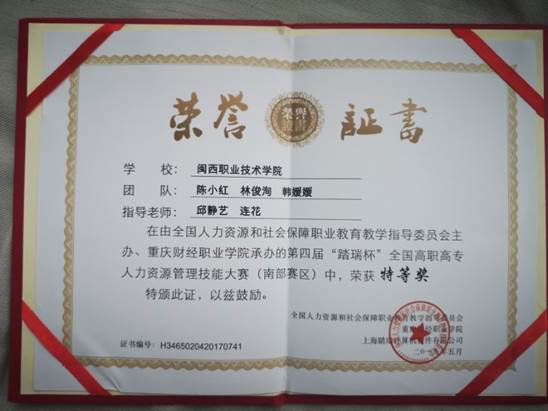 5月25日,由人力资源和社会保障教指委主办的第四届高职高专全国人力资源专业技能大赛在重庆举行。来自南部赛区的35支代表队参加了此次比赛。经过激烈角逐,最终我校学生取得了总成绩排名第三的历史最好成绩,斩获特等奖桂冠。该项赛事是目前高职人力资源管理专业在全国影响最广、参赛规模最大的比赛。参赛选手来自我校财经商贸学院17级人力资源专业的陈小红、韩媛媛、林俊洵(指导老师:邱静艺、连花)。据悉,这支队伍还将继续代表学院与来自其他四个赛区共56支队伍进军全国总决赛。