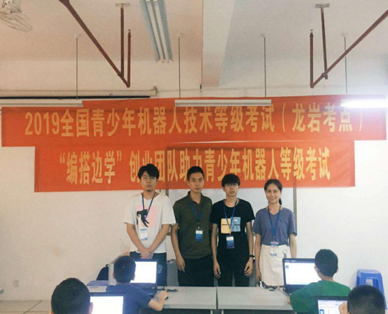 福建省机器人科教协会,龙岩市机器人教育协会,我校信息与制造学院相关教师担任本次考试监考与测评师。信息与制造学院创业团队“编搭边学”的王灵、姚攀义、赖伟玲同学承担考务工作。