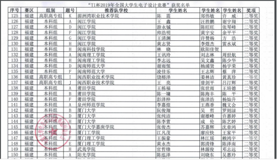 本届竞赛共吸引了来自全国29个省市区的1106所高校参赛,报名17361队,实际参赛并提交作品15501队,约52000名学生参赛。经全国竞赛专家评审和组委会审核,最终评选出296个全国一等奖,847个全国二等奖,其中一等奖获奖比例2.3%,全部国家奖获奖比例8%。本次竞赛福建省共参赛1178队,福建省获得全国一等奖为6队、全国二等奖72队,其中高职高专组共参赛78队,高职高专组共获全国一等1队,全国二等奖4队。我校共获得全国一等奖1队,全国二等奖1队。实现我校自2007年参加大学生电子设计竞赛以来首次获得全国一等奖的重大突破。同时还获得省级一等奖2项,省级二等奖2项,省级三等奖3项的优异成绩。