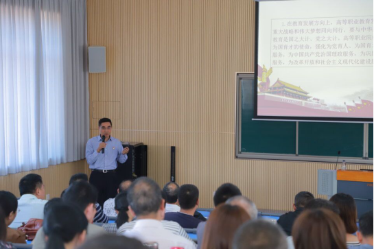 卢伟耀作了题为《让家国情怀浓烈在团结渠上》主题教育党课,他用生动的事例为师生们阐述了“家国情怀,高职院校的初心及使命”。他强调,“爱国”不是空洞的,是迫切的现实需要。高职院校的初心是坚持立德树人,使命是“坚持中国特色社会主义教育发展道路,培养德智体美劳全面发展的社会主义建设者和接班人。”奋力开创新时代教育工作新局面。我校坚持以习近平新时代中国特色社会主义思想为指导铸魂育人,要把习近平总书记关于教育的重要论述转化到对青年学生的培育引导工作上来,坚持以人民为中心的发展思想,做好“三全育人”。