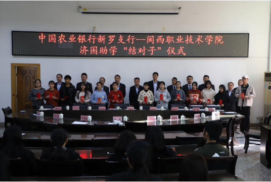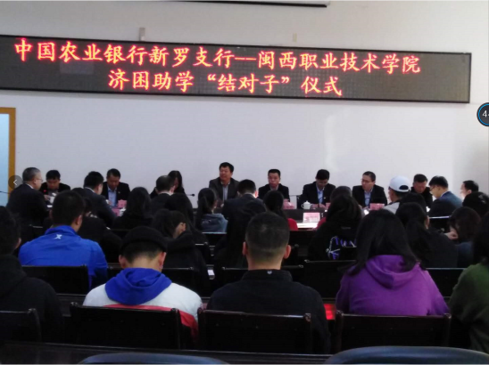 据悉,自2013年以来,农行新罗支行每年都与我校举行济困助学“结对子”帮扶活动,该活动由农业银行新罗区支行中层领导干部个人出资,一对一帮扶我校品学兼优的在校贫困生顺利完成大学学业。
