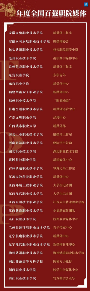 日前,我校学生全媒体中心在由中国青年报社、中青校媒主办的2019年度全国百强校园媒体活动中,挺进全国100强,荣获“2019年度全国百强职院媒体”。