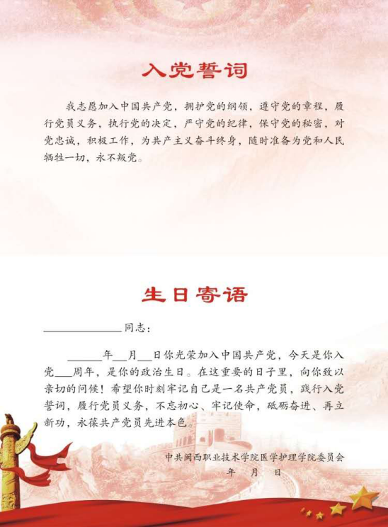 2020年,医护学院党委为全面落实《中共中央关于加强党的政治建设的意见》,严肃党内政治生活,制定了《医学护理学院组织开展党员政治生日活动细则》,由党支部组织开展党员政治生日“六个一”活动,进一步加强党员党性教育,推进“不忘初心、牢记使命”主题教育常态化、制度化,强化党员身份意识、责任意识、宗旨意识,增强党组织的向心力和凝聚力。
