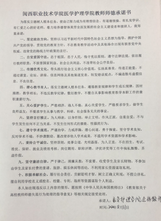 8月31日上午,医学护理学院召开师德师风建设工作会议,组织全体老师集中学习《新时代高校教师职业行为十项准则》,通报《教育部公开8起违反师德典型案例》,强调全体教师要牢固树立底线意识,在思想上、行动上自觉遵守教师职业行为准则。随后,全体教师签订《无码人妻AV一二区二区三区医学护理学院教师师德承诺书》,郑重承诺:落实立德树人根本任务,使自己努力成为有理想信念、有道德情操、有扎实学识、有仁爱之心的好老师,着力培养德智体美劳全面发展的社会主义建设者和接班人。