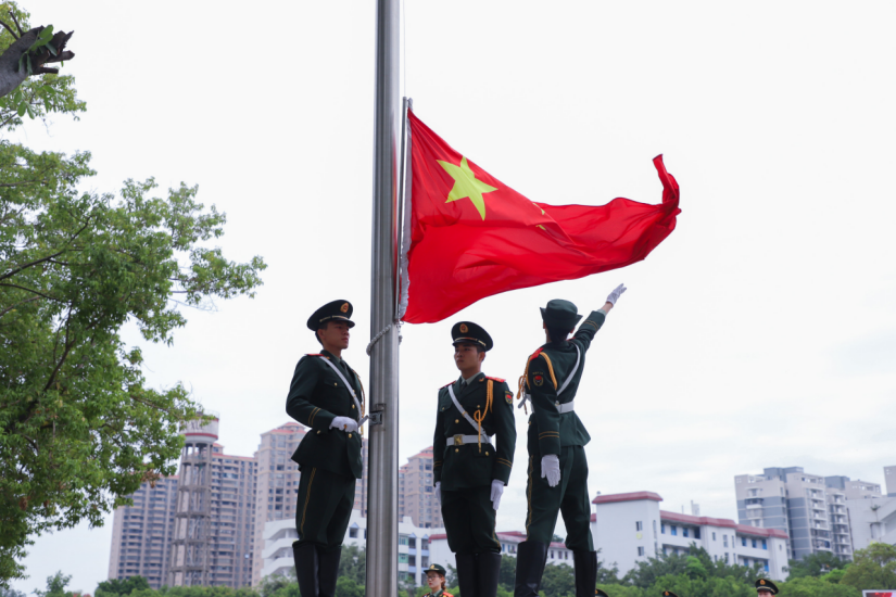 上午8时30分,在铿锵有力、整齐划一的脚步声中,国旗仪仗队来到升旗台前护卫国旗。《义勇军进行曲》响起,五星红旗冉冉升起。在场领导及全校师生庄严站立,面向五星红旗高唱国歌,激情澎湃。