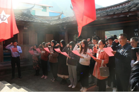 师生们来到象湖镇红色革命旧址群进行原型探访、红色走读和实地体验、重温入党誓词等系列活动,深入了解红四军出击闽中、挺进漳平的战斗历史,聆听革命先辈追求真理、坚守信仰的生动事迹,接受爱国主义教育和“军民鱼水情、诚信赢民心”的红土诚信教育。随后,全体师生实地参观东湖古民居建筑,学习前人的建造智慧,感受古韵东湖之美。